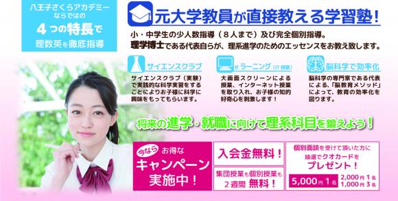 元大学教員が本格的な学童保育と理系授業を驚きの低価格で行います。元大学教員が行う個別指導授業が受けられます!小学生・中学生・高校生全てに対応。八王子さくらアカデミーは、八王子南口から徒歩7分の個別指導学習塾です。 進学塾でも補習塾でもありません。 受験はもちろんのこと社会で役立つスキルアップを目指します。サイエンスクラブ(実験)で実践的な科学実習をすることによりお子様に科学に興味をもってもらいます。授業にITを取り入れ、個人個人の特性にあったオーダーメイド教育を行います。脳科学を取り入れた教育法によって、教育の効率化をはかります。